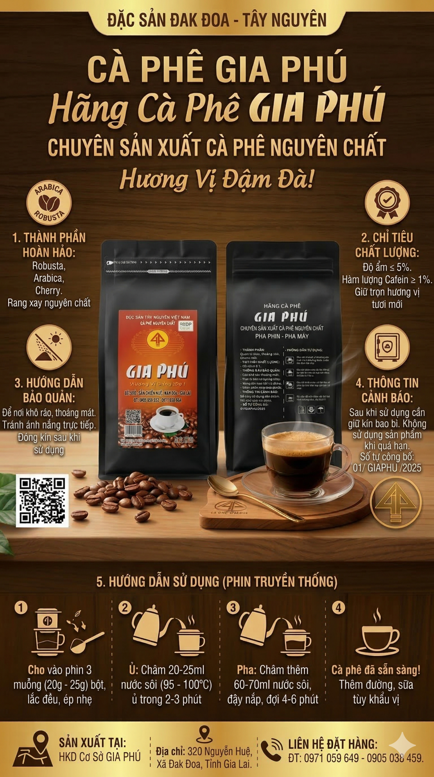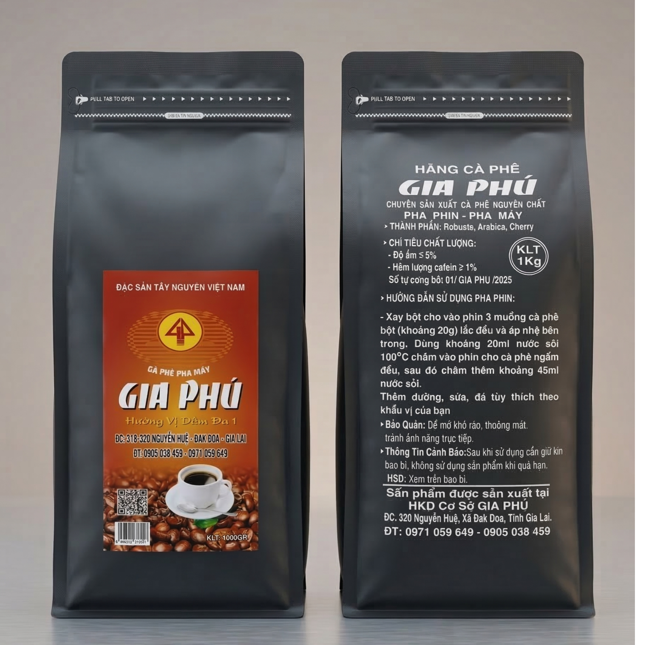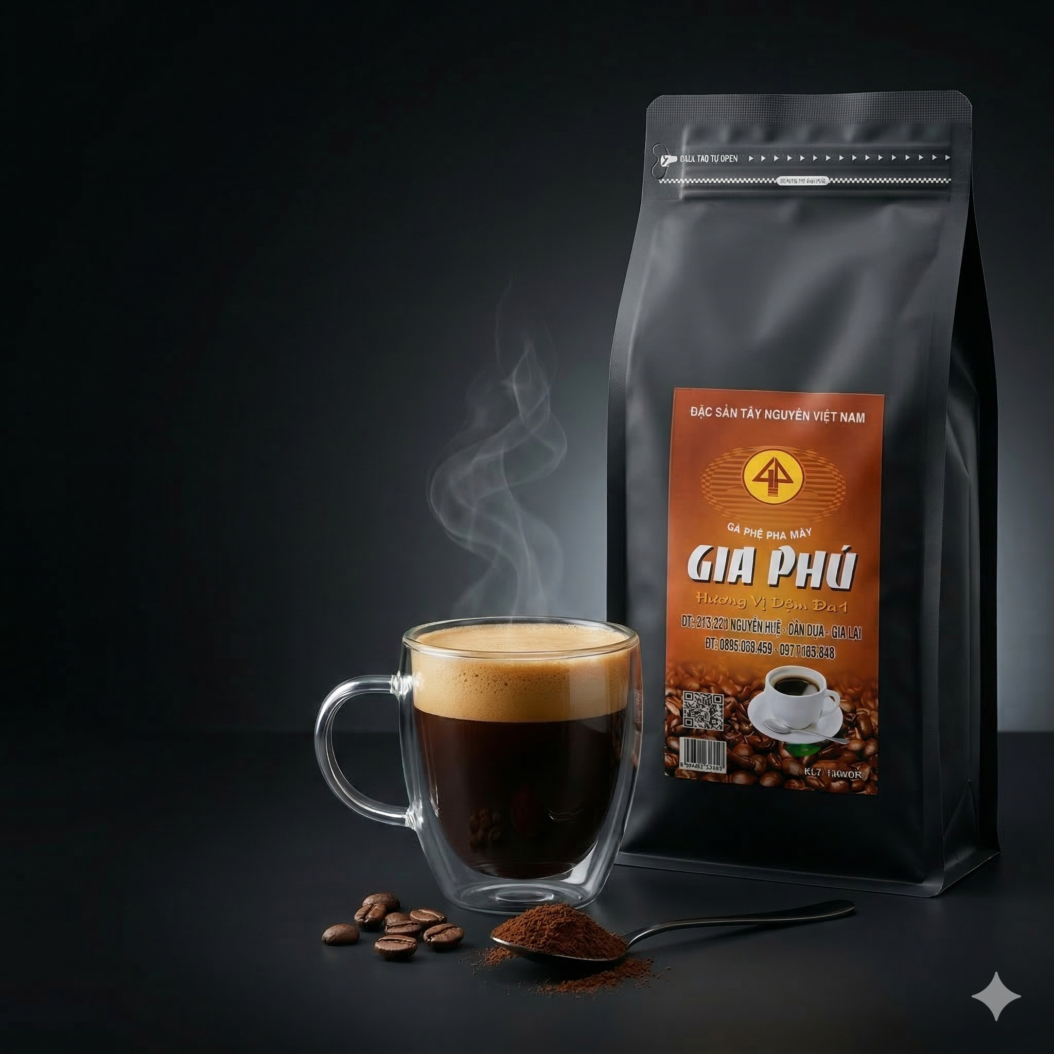 Từng mẻ cà phê được rang xay theo quy trình riêng, đảm bảo giữ trọn hương thơm tự nhiên, không pha tạp, không chất phụ gia. Khi pha máy, cà phê cho dòng chảy đều, màu nâu cánh gián đẹp, vị đậm rõ, hậu vị êm và sâu. Sản phẩm phù hợp cho cả sử dụng gia đình, văn phòng hoặc kinh doanh quán cà phê, đáp ứng tốt nhu cầu pha phin truyền thống và pha máy hiện đại. Không chỉ là thức uống giúp tỉnh táo, Gia Phú còn mang đến trải nghiệm thưởng thức đậm chất Tây Nguyên – chân thật, mạnh mẽ và đầy cảm xúc.