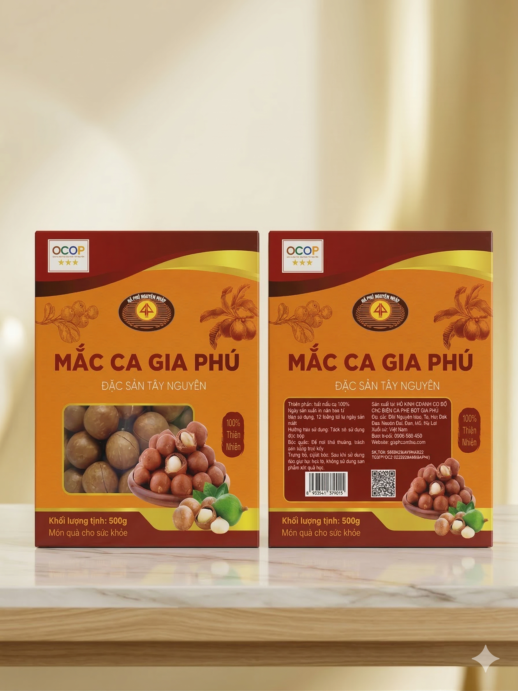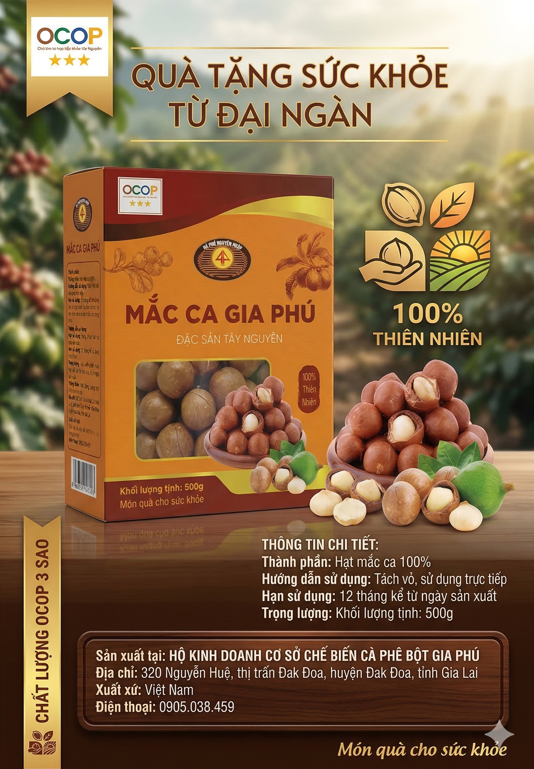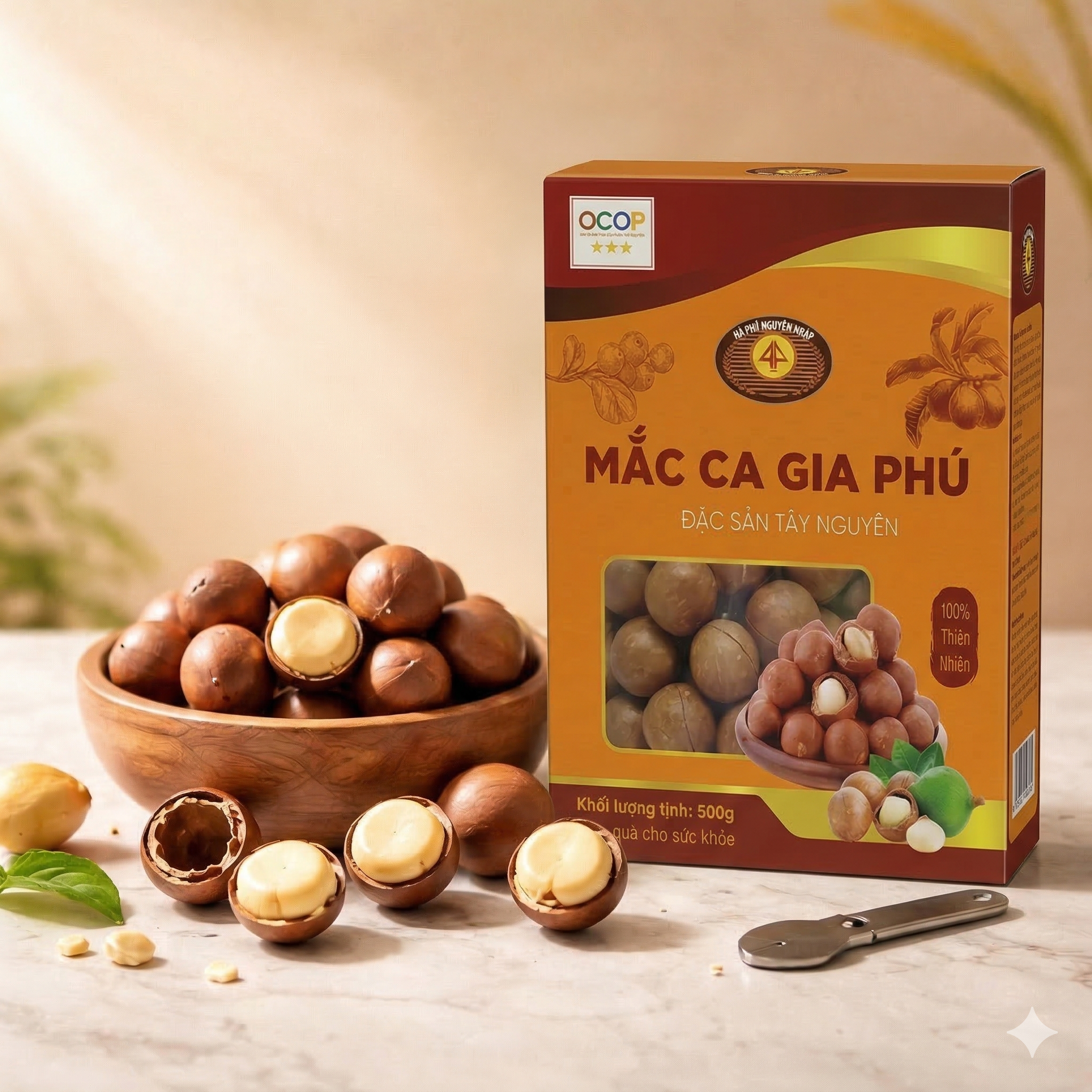 Hạt mắc ca Gia Phú – tinh hoa đặc sản Tây Nguyên đạt chuẩn OCOP 4 sao, được tuyển chọn từ những hạt macca chất lượng cao và chế biến hoàn toàn tự nhiên, không chất bảo quản. Từng hạt mang vị béo bùi đặc trưng, thơm nhẹ, giữ trọn giá trị dinh dưỡng với hàm lượng Omega 3,6,9 cùng nhiều vitamin và khoáng chất thiết yếu, giúp nuôi dưỡng cơ thể từ bên trong, hỗ trợ tim mạch, cải thiện làn da và bổ sung nguồn năng lượng lành mạnh mỗi ngày.